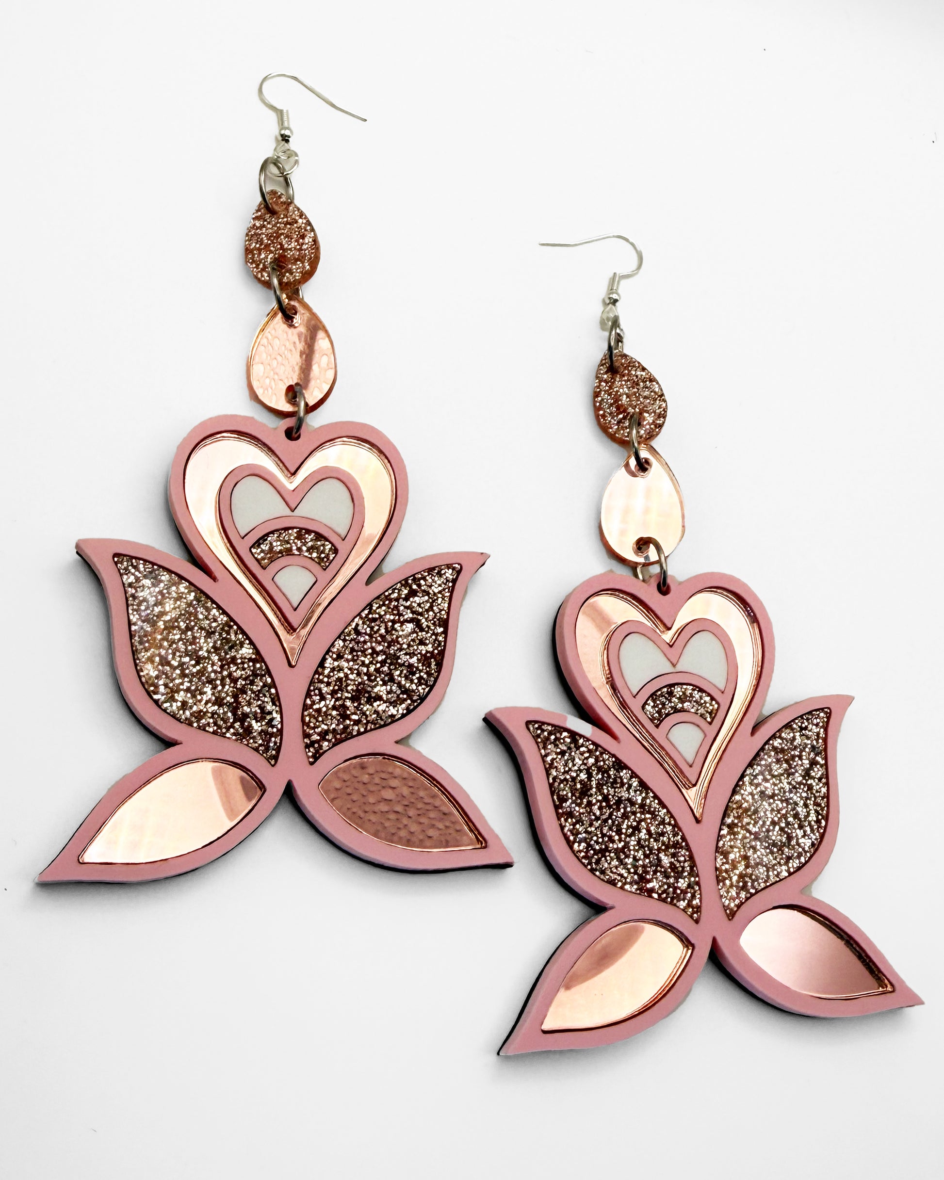 A heart-centered floral design layered in pastel pink acrylic, rose gold mirror, and soft shimmer. Lightweight, luminous, and rooted in care, love, and continuity.