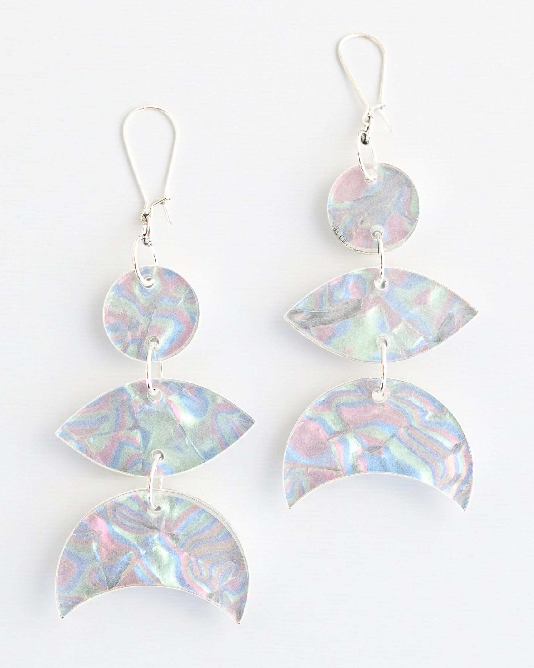 A circle, an arc, and a crescent, stacked to mirror the shifting phases of the moon. Cut from pearl-iridescent acrylic, they shimmer softly as they move, catching light with every angle. At 3.5 inches long, they’re featherlight yet striking, balancing celestial energy with a modern edge.