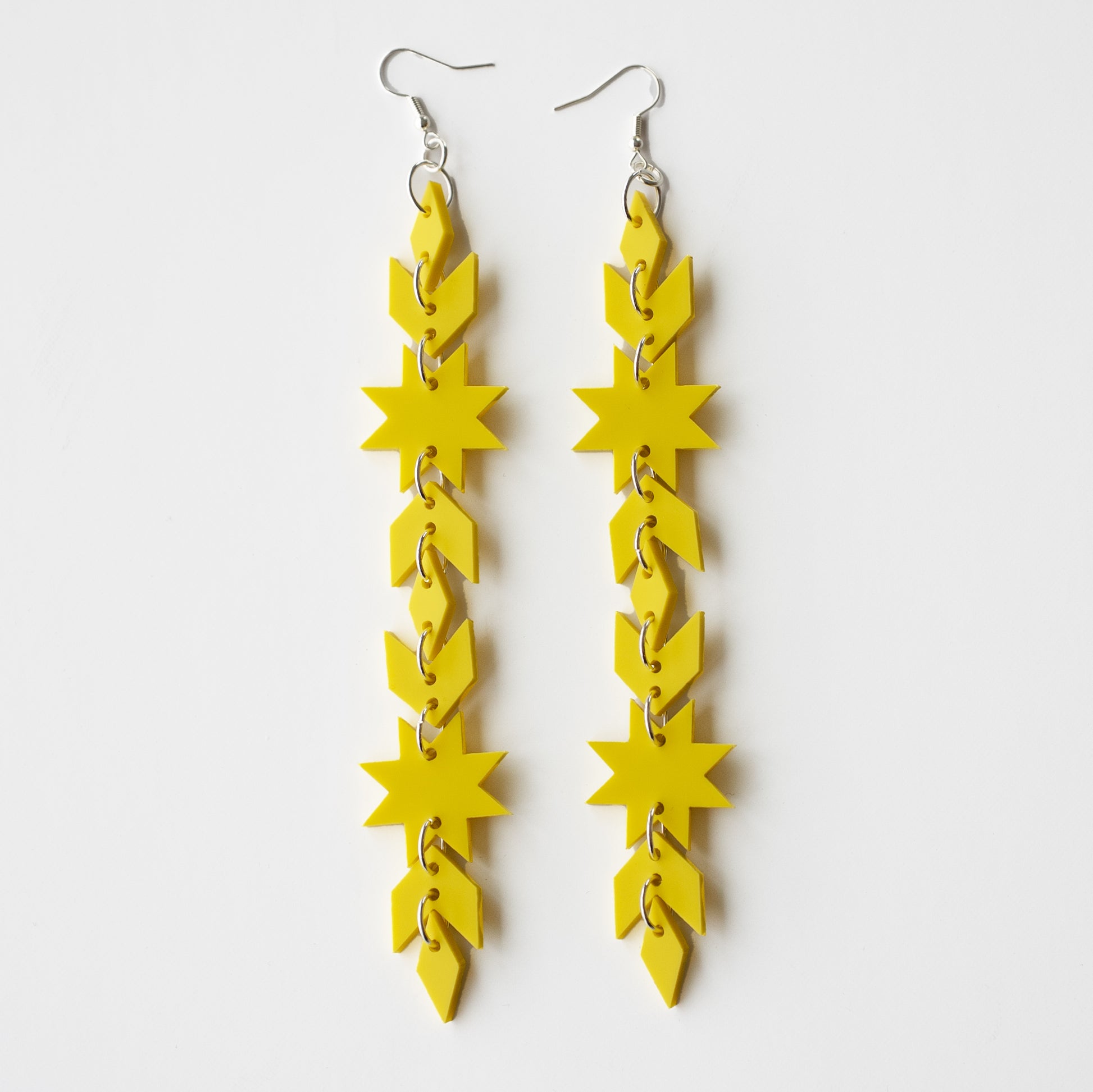 Featuring a vibrant Lightning Yellow hue, this piece is equipped with silver hypoallergenic hooks and measures 7 inches in length.